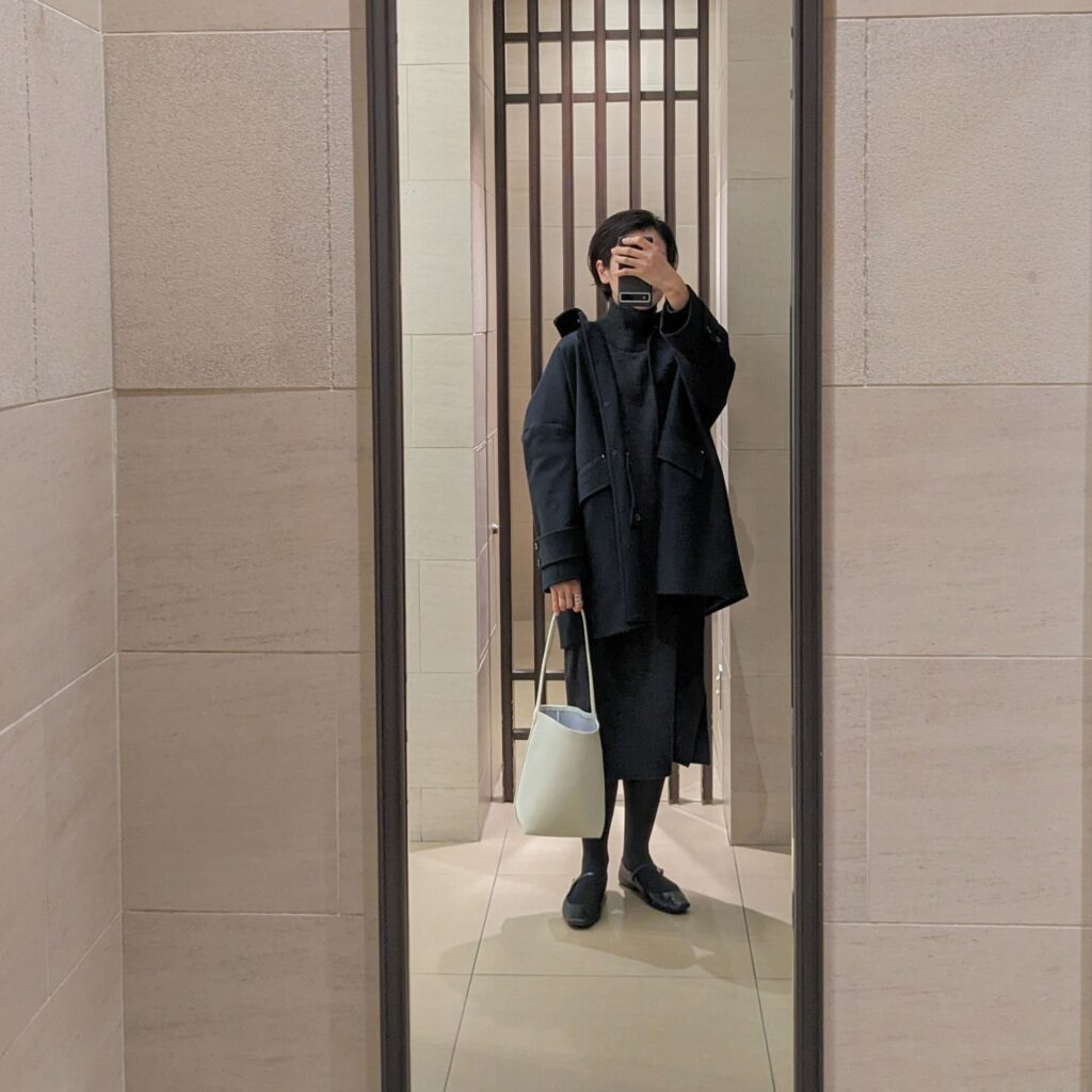 カラーも目移りしましたが、ブラウンは濃い目のグレージュという感じ。落ち着いていてベージュ系の装いのときはもちろん、ネイビーやブラックなどの濃色の装いのときにもよく合います。