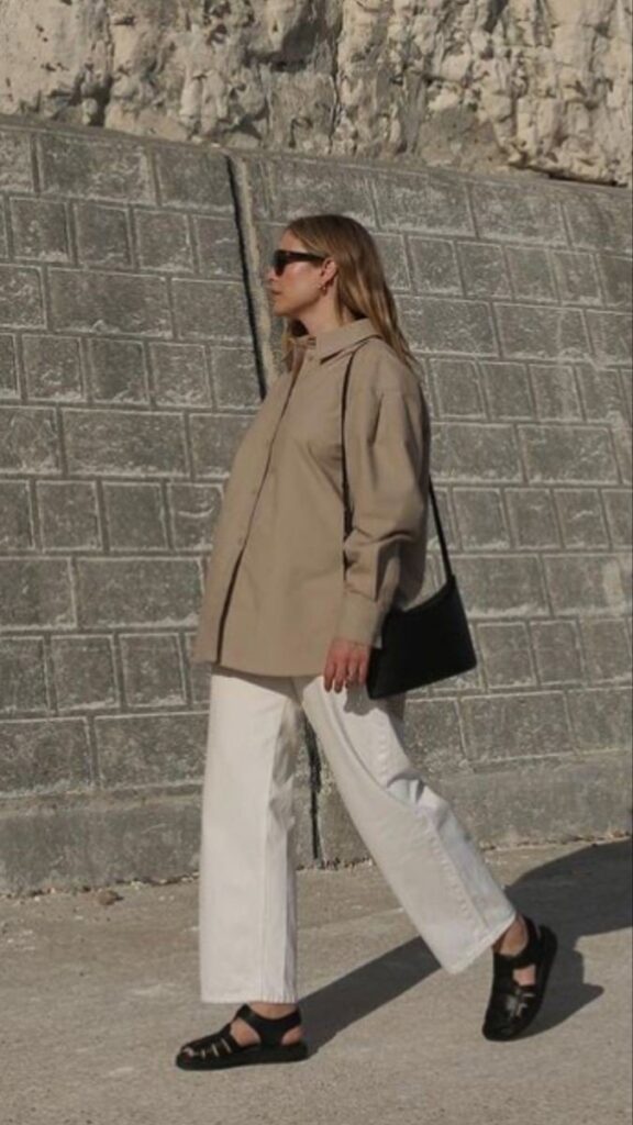 足元はCHANELのバイカラーシューズ。夜ごはんの時に持てるように、the rowのサテンバッグも持参。
