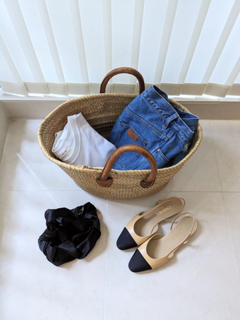 2日目の日中は、Tシャツにジーンズで過ごすよう考えて、籠に入れてみました。(実際は着替え袋に入れていきますよ)